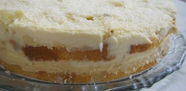 Espalhe metade do creme de chocolate branco e coloque por cima o abacaxi Finalize com 1 xícara (chá) de coco em flocos previamente hidratado no restante da calda. Cubra com a outra camada de massa e espalhe o creme de chocolate branco restante. Polvilhe o coco em flocos. Mantenha em geladeira até o momento de servir