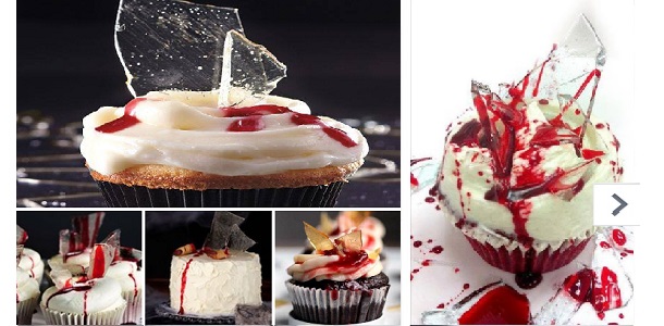 4. Usa el vidrio de azúcar transparente y un glaseado rojo en gel para cubrir magdalenas aterradoras. Glasea algunas magdalenas con un glaseado blanco de crema de mantequilla. Coloca pedazos de vidrio de azúcar transparente. Vierte el glaseado para escribir o en gel de color rojo sobre los bordes superiores del azúcar glas.