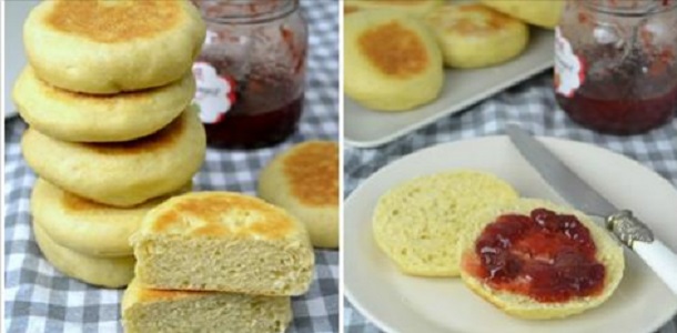 La receta original es la de los muffins ingleses, esos panecillos que son la base de los famosos huevos benedictinos pero adaptada para hacerla, si se puede, aun más sencilla. Lo mejor de estos panes, aparte de hacerlos sin horno, es que están buenos tanto con dulce como con salado y además te solucionaran el desayuno, la merienda o incluso la cena de domingo ¡Si, esa en la que te toca ir a por la barra de pan a la gasolinera más cercana! Olvídate de eso, a partir de ahora esta receta será tu salvación.