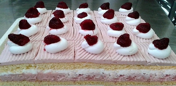 En el primer plato del camino frío, coloque la ½ crema y la crema batida sobre la crema (untamos con crema y cinta). Continúa la segunda manera y la crema restante. La parte superior del postre se puede adornar con crema batida y frambuesas enteras.
