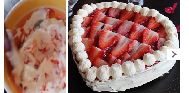 Con esta mezcla de nata y fresas vamos a rellenar la primera y segunda capa de la tarta.