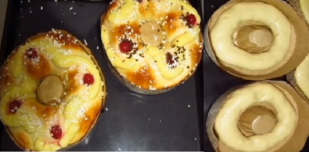 En un bol colocaremos 100 grs. de Azúcar, 10 grs. de Extracto de Malta (Se puede remplazar por miel), 100 grs. de agua, 20 grs. de esencia de Vainilla, mezclaremos bien, reservaremos. En otro bol colocaremos 500 grs. de Harina 0000, 10 grs. de Levadura seca y 10 grs. de leche en polvo mezclaremos bien. En centro incorporaremos el agua con al azúcar la esencia y el extracto de malta que reservamos previamente, mezclaremos y colocaremos 200 grs. de Huevos, continuaremos mezclando e incorporaremos la ralladura de limón, mezclar, por ultimo colocares la esponja ya leudada y desgasificada por pedazos. Comenzaremos y amasaremos hasta que logremos una masa lisa y suave por 20 a 30 minutos, una vez logrado el punto desgarraremos la masa y colocaremos 100 grs. de Manteca en el centro, continuaremos amasando por 15 minutos más, hasta obtener una masa lisa, suave y elástica. Cortaremos bollos de 400 grs. c/u, perforaremos el centro iremos girando hasta formar la rosca. Dispondremos en un molde de papel de 20 cm de diámetro, pincelaremos con huevo y dejaremos leudar hasta que duplique su volumen.
