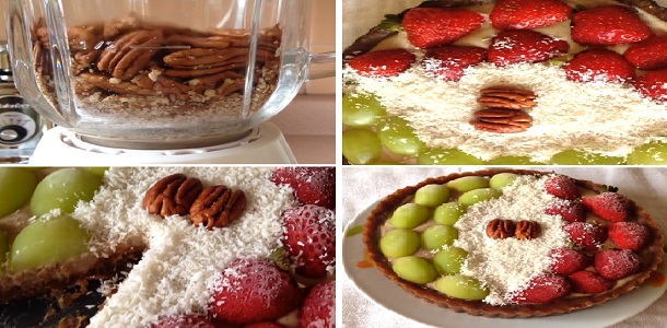 En un molde para tarta (yo utilicé uno desmontable de 20 cm x 7 cm) coloca la mezcla de dátil con nuez y aplánala muy bien por todo el molde cuidando que los costados estén firmes