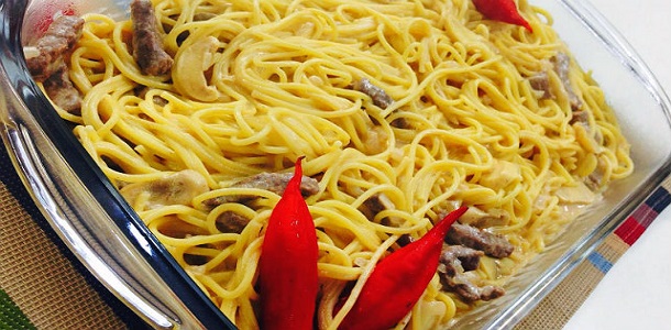 – Coloque a água e deixe cozinhar até amaciar a carne. Adicione o catchup e o champignon, logo em seguida coloque o creme de leite.