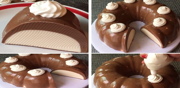 Una vez que este lista la gelatina de leche la despegamos del molde sin desmoldar (en el mismo molde como la flotatina) y vertimos la gelatina de chocolate, nos ase3guramos que la gelatina de leche flote y refrigeramos. Desmoldamos y listo¡¡¡