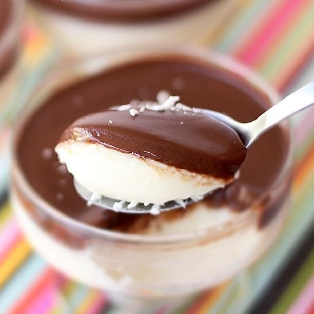 5. Distribua o recheio de beijinho em taças individuais, cubra com o creme de chocolate e leve à geladeira por 3 horas.